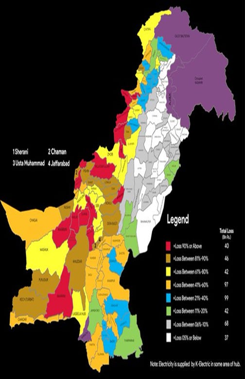 The above shape is the classic pattern analysis electricity theft across districts in Pakistan. Red is above 90 % theft, brown between 80 & 90 & and white less than 5 %. It says as much it does - the rogue districts lie in Balochistan and KP Provinces. But why is the question that reader has to answer himself.