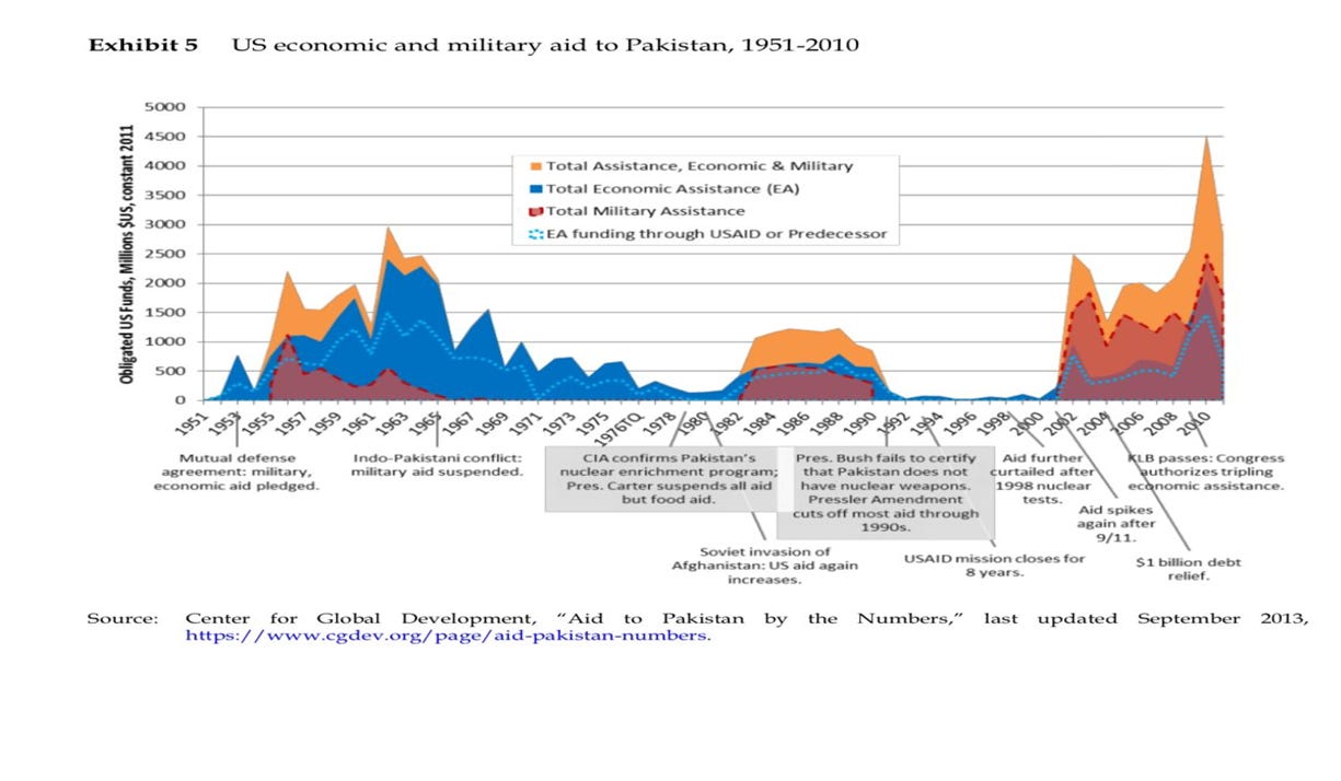 This one is better graph in so much that it includes both trend and patterns. The graph shows US assistance to Pakistan divided between economic, military and development aid. You get to see the periods of highs and lows of aid and also the composition or pattern. It is a neat situation analysis, but causation is still absent. Not that it cannot be deciphered. Like the informed observers of national security and international observers can identify the contributory factors like US intervention in Afghanistan and Cold War/War on Terror as contextual factors. But that is separate from this graph.